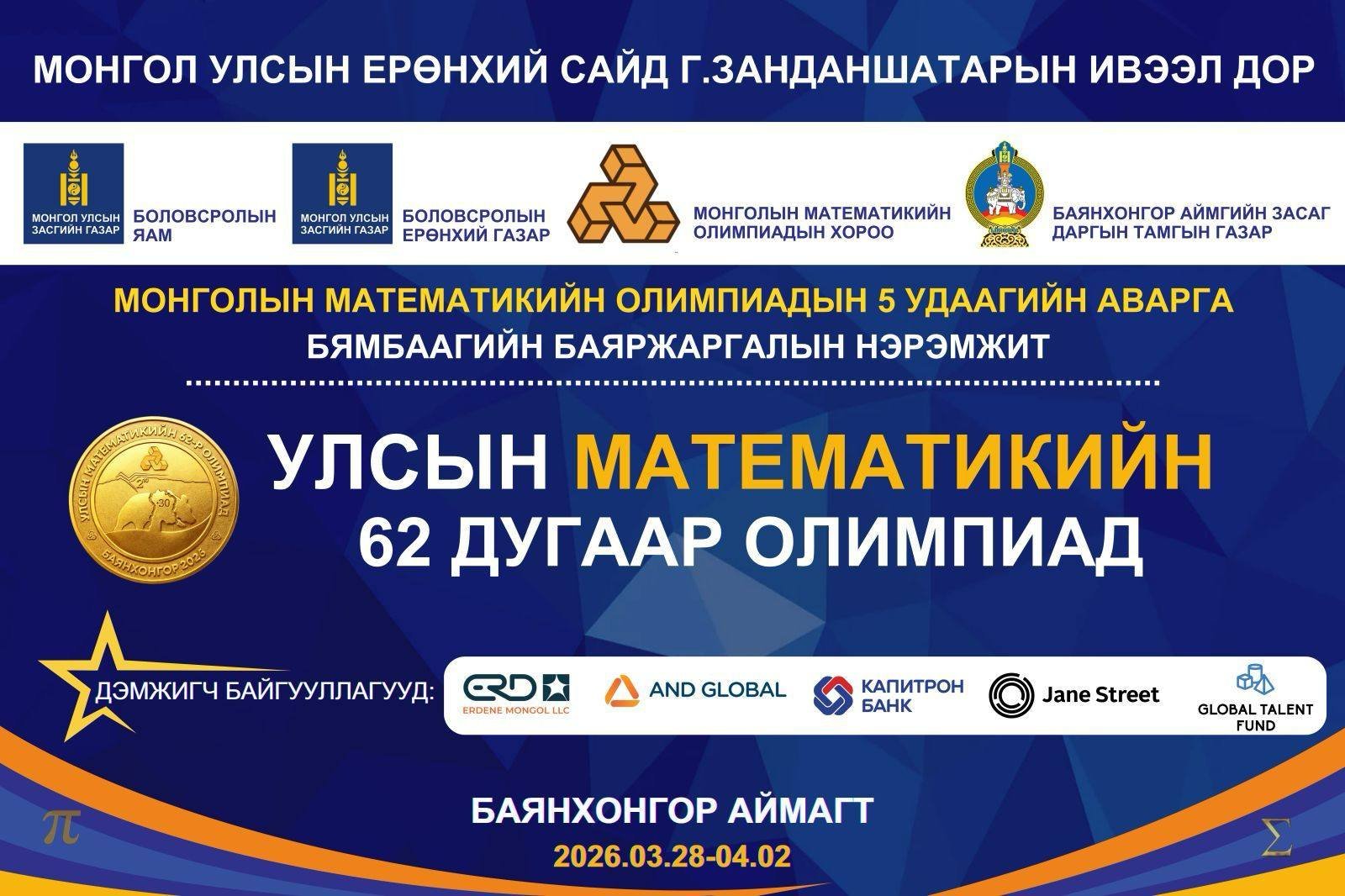 Монгол Улсын математикийн 62 дахь удаагийн олимпиад өнгөрөгч долоо хоногт Баянхонгор аймагт зохион байгуулагдлаа.