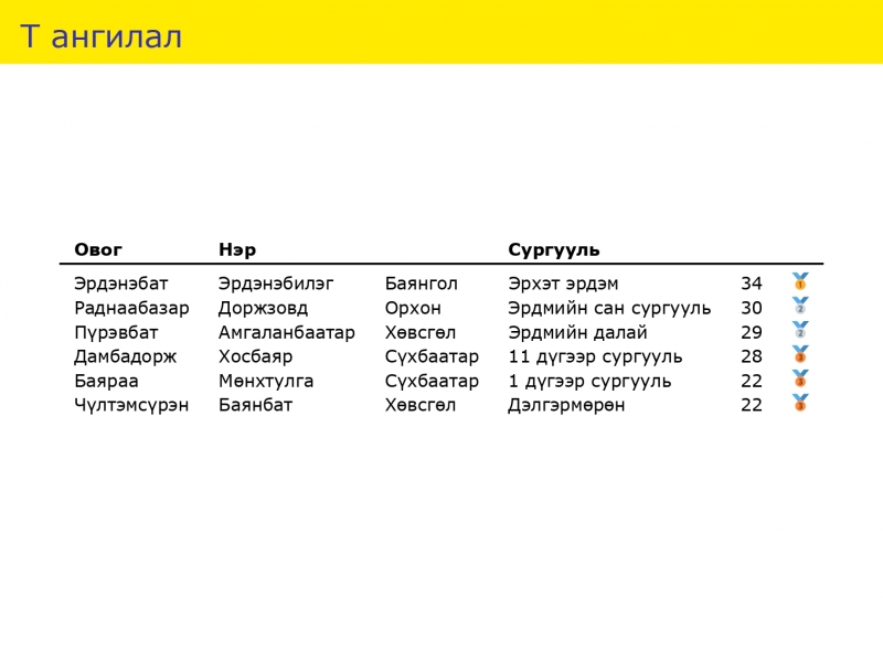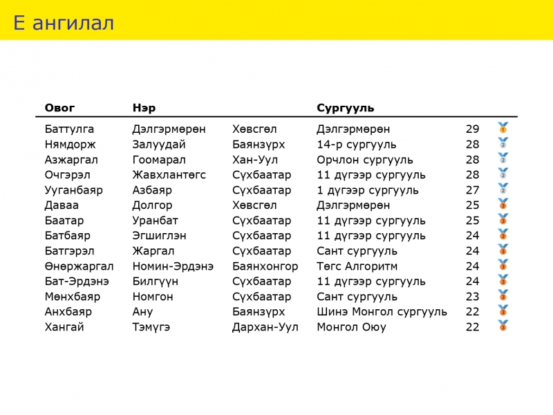 Улсын математикийн 62 дахь удаагийн олимпиадын үр дүнг доорх зурагт үзүүллээ.