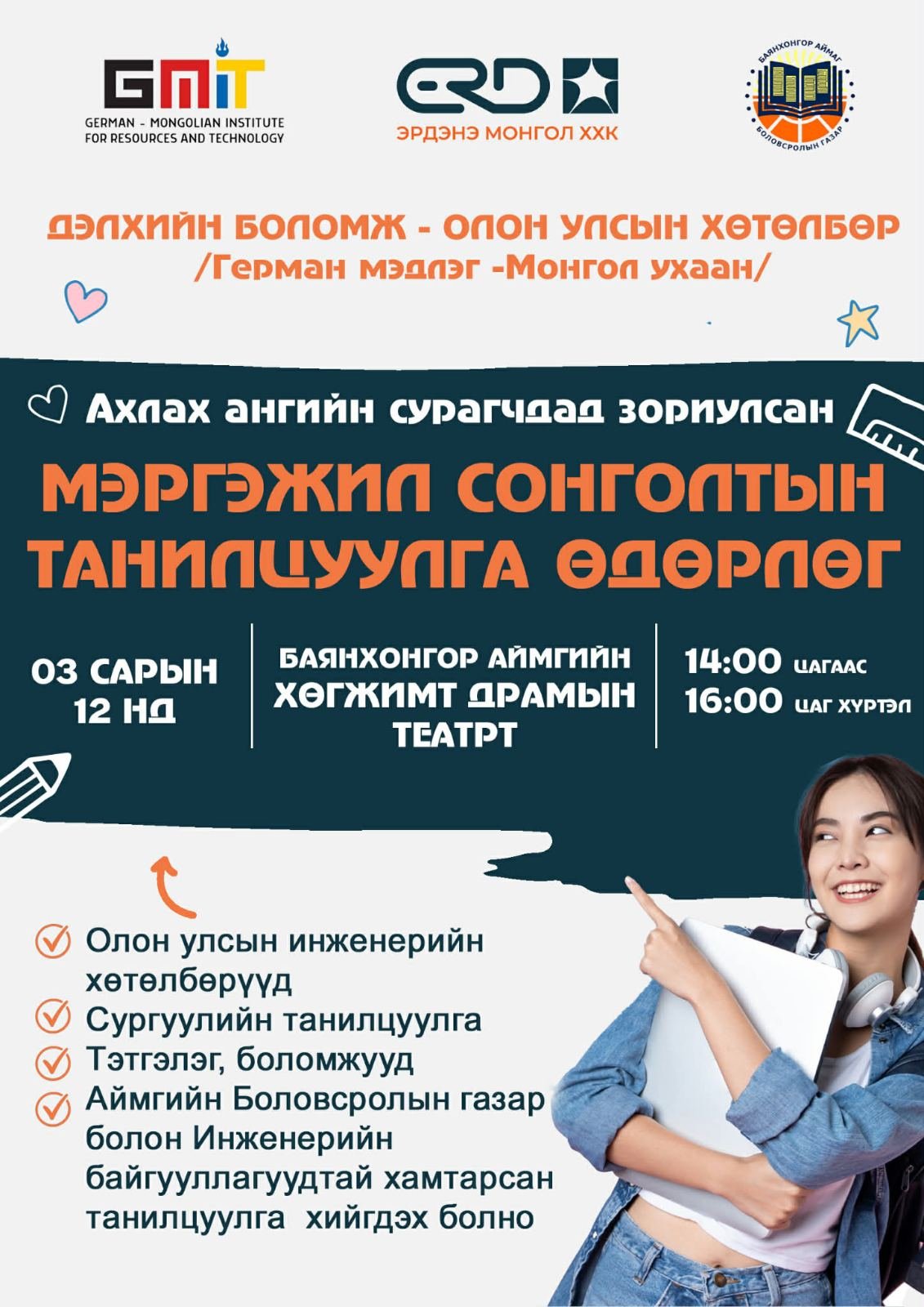 Эрдэнэ Монгол ХХК нь Монгол, Германы хамтарсан технологийн коллеж болон Баянхонгор аймгийн Боловсролын газар-тай хамтран ахлах ангийн сурагчдад зориулсан мэргэжил сонголтын танилцуулга өдөрлөг зохион байгуулах гэж байна.